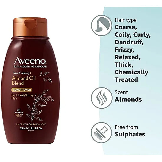 Product Description: Aveeno Frizz-Calming+ Almond Oil Blend Conditioner is a nourishing conditioner designed to help calm frizzy hair and leave it smooth and manageable.